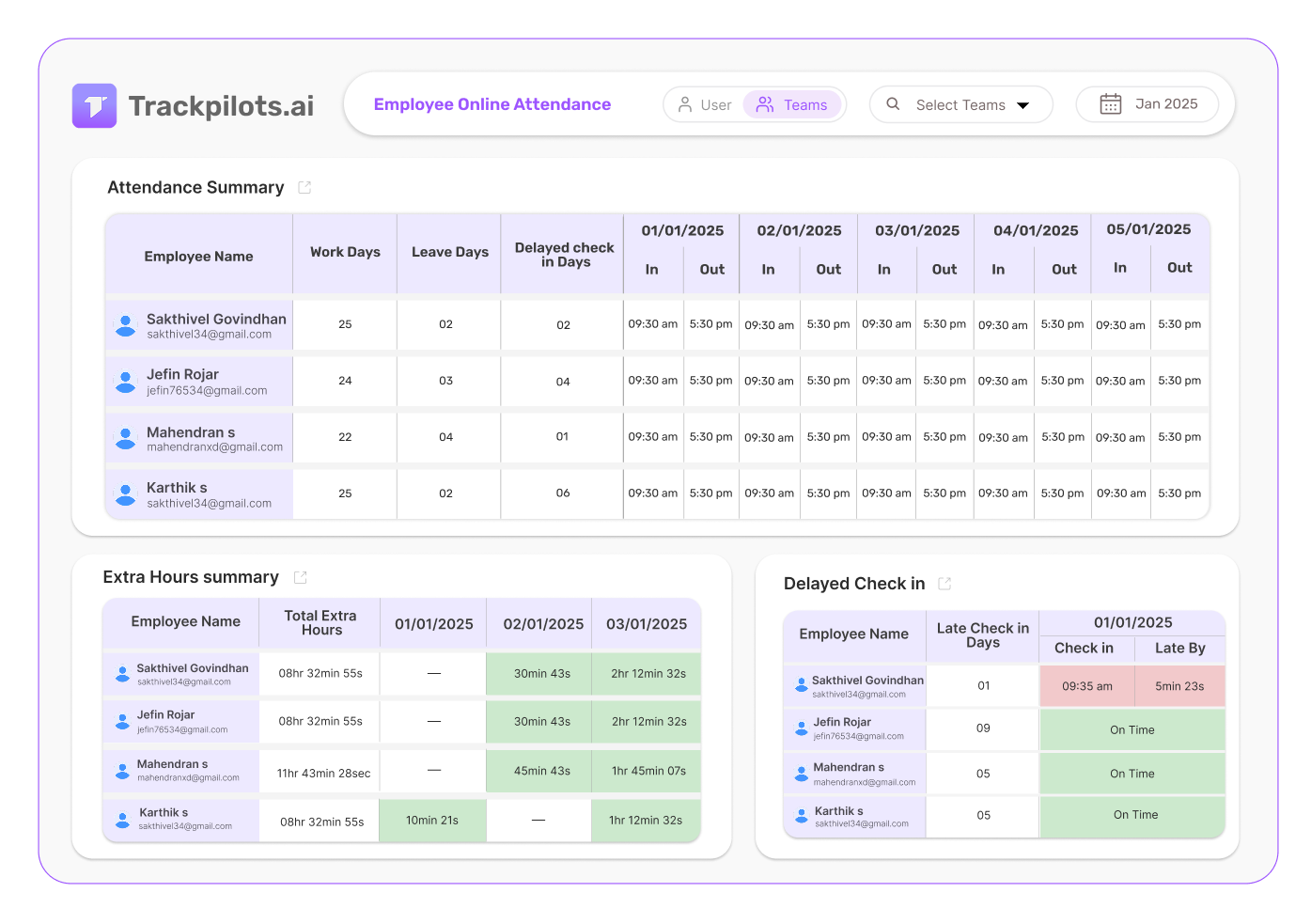 Trackpilots provides a smart attendance tracking system with Attendance Summary, Daily Insights, Delayed Check-In, and Work Activity Log to ensure accurate attendance records, boost efficiency, and streamline workforce management.